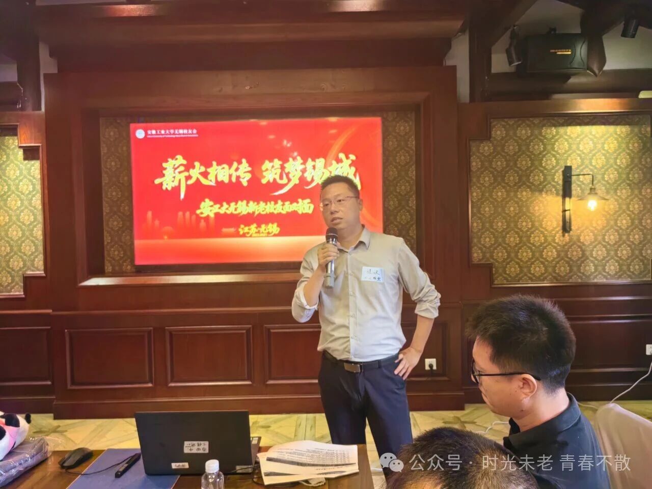 活动伊始,无锡校友会荣誉顾问、78 级轧钢专业朱雪松校友率先登台发表开场欢迎词。作为校友中的前辈,他结合自身数十载的人生阅历与职场经验,以 “成长” 为核心,从四个维度为在场校友带来诚挚教诲与宝贵谏言。谈及 “重构生命的坐标”、“寻找生命的熵减之道” 、“培育心灵的韧性肌肉”、“书写生命的强度密度” 等多维度分享谏言。朱雪松校友的发言质朴而深刻,如同长辈的殷切嘱托,引发台下校友强烈共鸣,现场掌声不断。随后,无锡校友会秘书长06级材料专业冯斌上台,对校友会上半年工作进行全面总结。他条理清晰地梳理了上半年组织的企业参访、校友联谊、就业帮扶等活动成果,让在场校友清晰了解校友会的工作动态与服务方向,也为后续工作开展奠定基础。