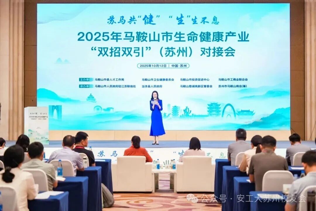 秋意正浓,金桂飘香。10月12日,2025年马鞍山市生命健康产业“双招双引”(苏州)对接会在苏州隆重举行。安徽工业大学苏州校友会倾力协助,为活动提供了全方位保障,成为连接马鞍山与苏州两地产业资源的重要桥梁。