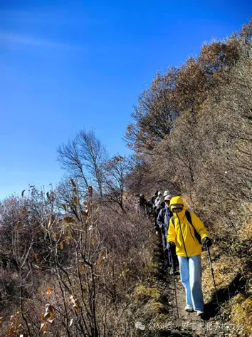 清晨,薄雾微凉,参与活动的校友与家属们准时在北灵山脚下集合。在组织者罗小兵校友简要介绍了路线安排与安全注意事项后,队伍精神抖擞地向着海拔近2000米的北灵山主峰进发。秋日的北灵山,层林尽染,斑斓的色彩泼洒于群山之间,黄栌、枫树、白桦交织出一幅绚丽的油画长卷。清新的空气伴着泥土与草木的芬芳,让大家瞬间忘却了都市的喧嚣,沉浸于登山的乐趣之中。