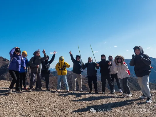 北京校友会秘书长董强为本次活动提供了坚实的后勤物资保障,充足的饮用水和能量补给为大家顺利登顶注入了满满活力。经过数小时的奋力攀登,队伍成功会师北灵山之巅。极目远眺,群山巍峨,秋色壮阔,成就感和喜悦感洋溢在每个人的脸上。大家在峰顶挥舞起鲜艳的校友会会旗,定格下这难忘的瞬间,一张充满成就感与欢声笑语的合影,成为了此次登山活动最生动的注脚。