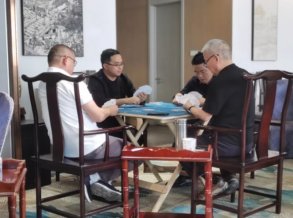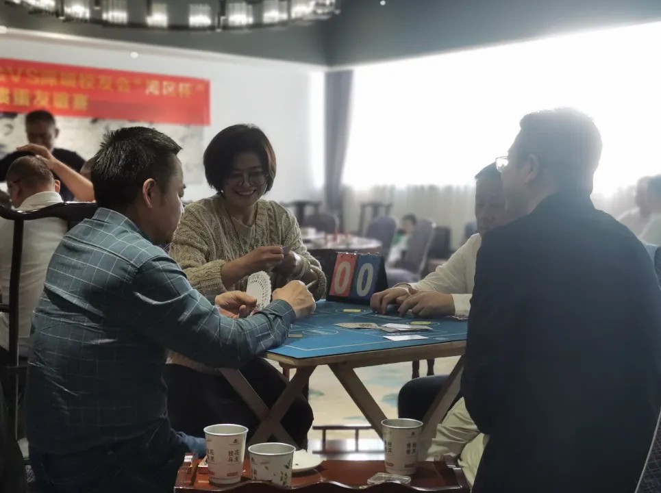 随着裁判长(广东校友会执行会长王继红)宣布开赛,4 支广东校友战队正式亮相:“中国之宝” 队(周其中 + 许进宝)、“双灵队”(张凌 + 吴春林)、“共克时艰” 队(汪克宽 + 时晓东)、“春满民间” 队(蔡春满 + 陈汉民),与深圳校友队展开 4 小时脑力角逐。牌桌上,选手们眉头微蹙、聚精会神,每步出牌都藏着策略;观牌区的校友微笑不语,默契守着 “观牌不语” 的默契;座谈区的交流热络不已,校园旧忆与职场近况让赛场暖意融融。